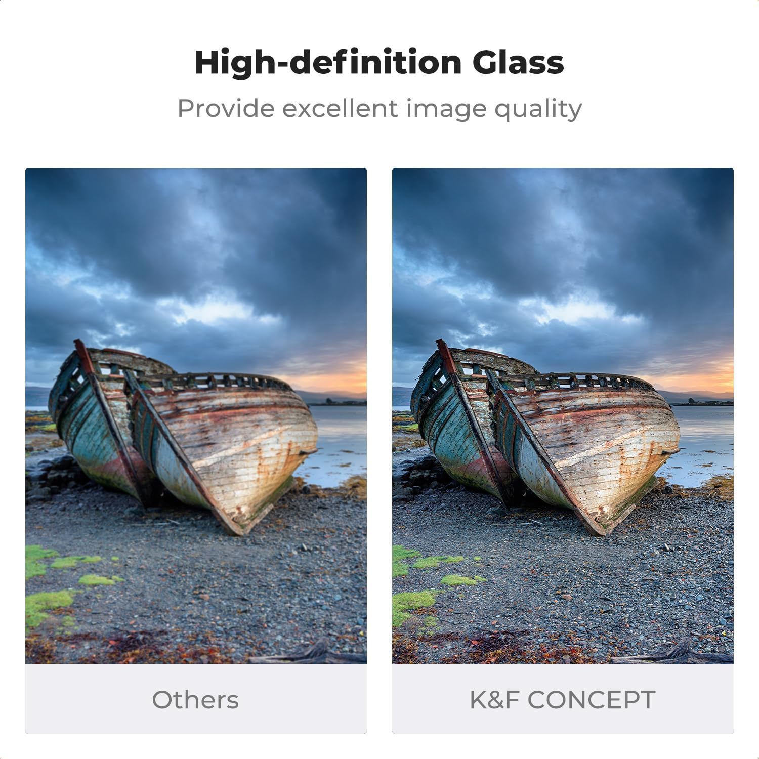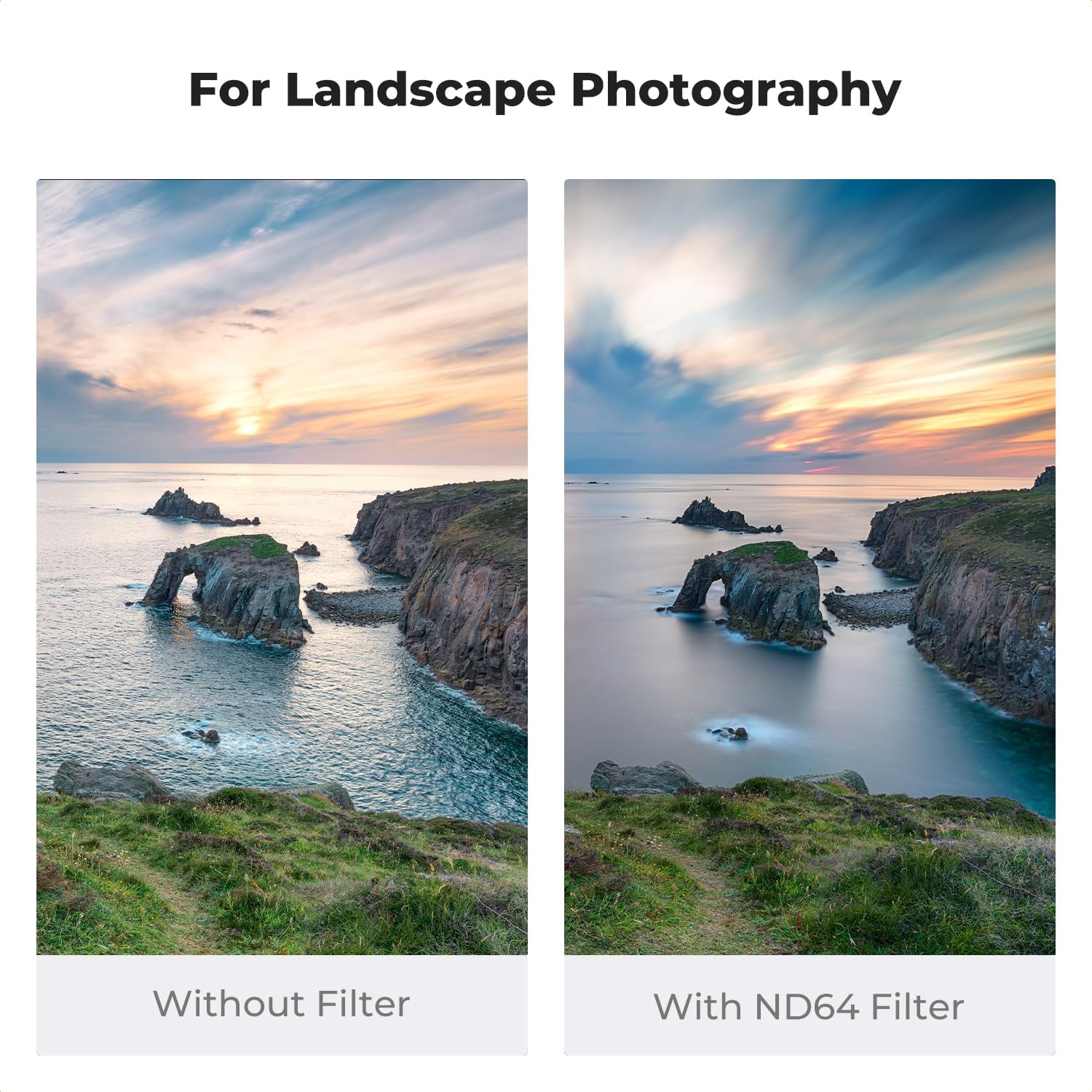 ND フィルターは、川、滝、その他の水域、特に明るい光の下に適しています。 露出時間が長いほど、よりスムーズな水の動き、浅い被写界深度、ぼやけた動きを可能にします。