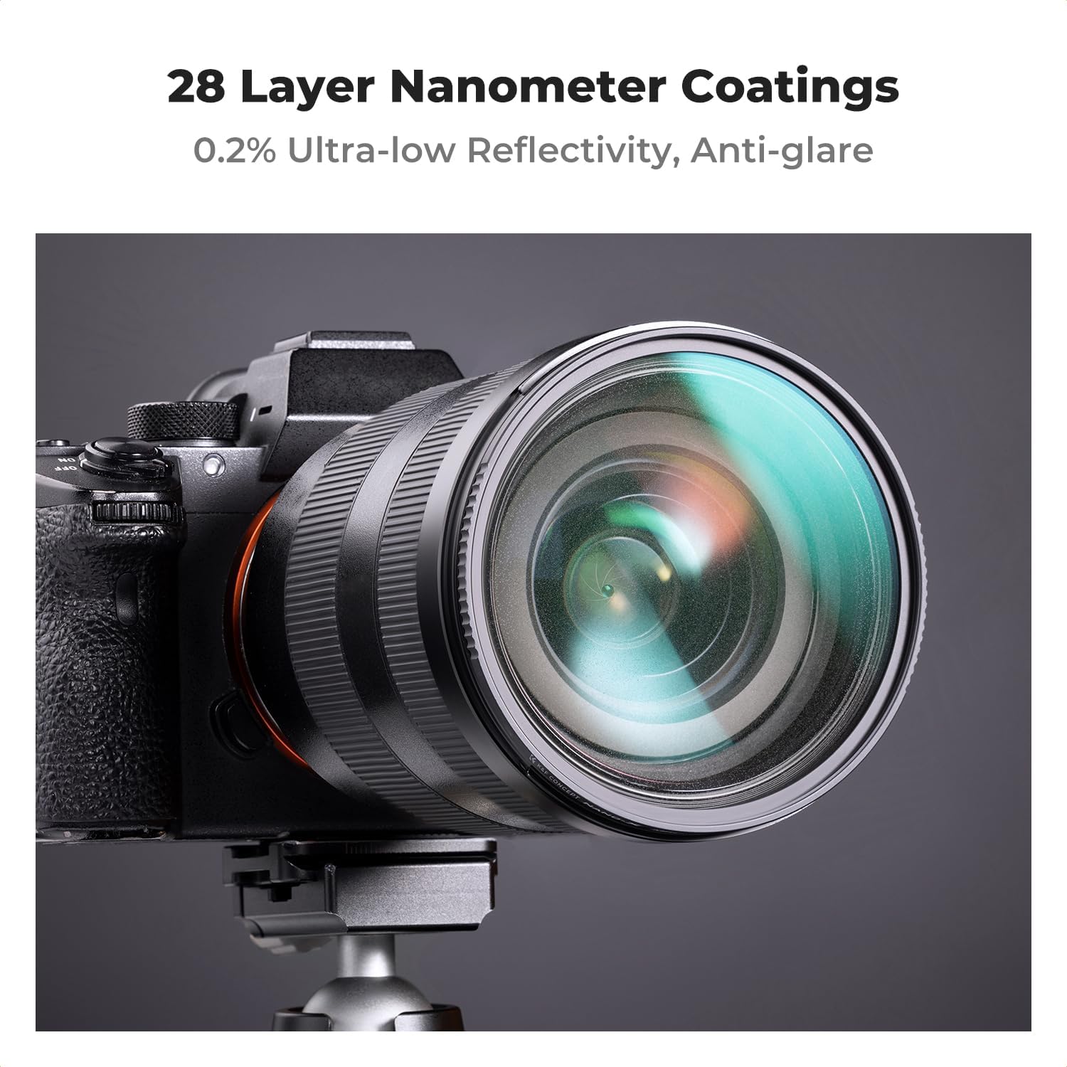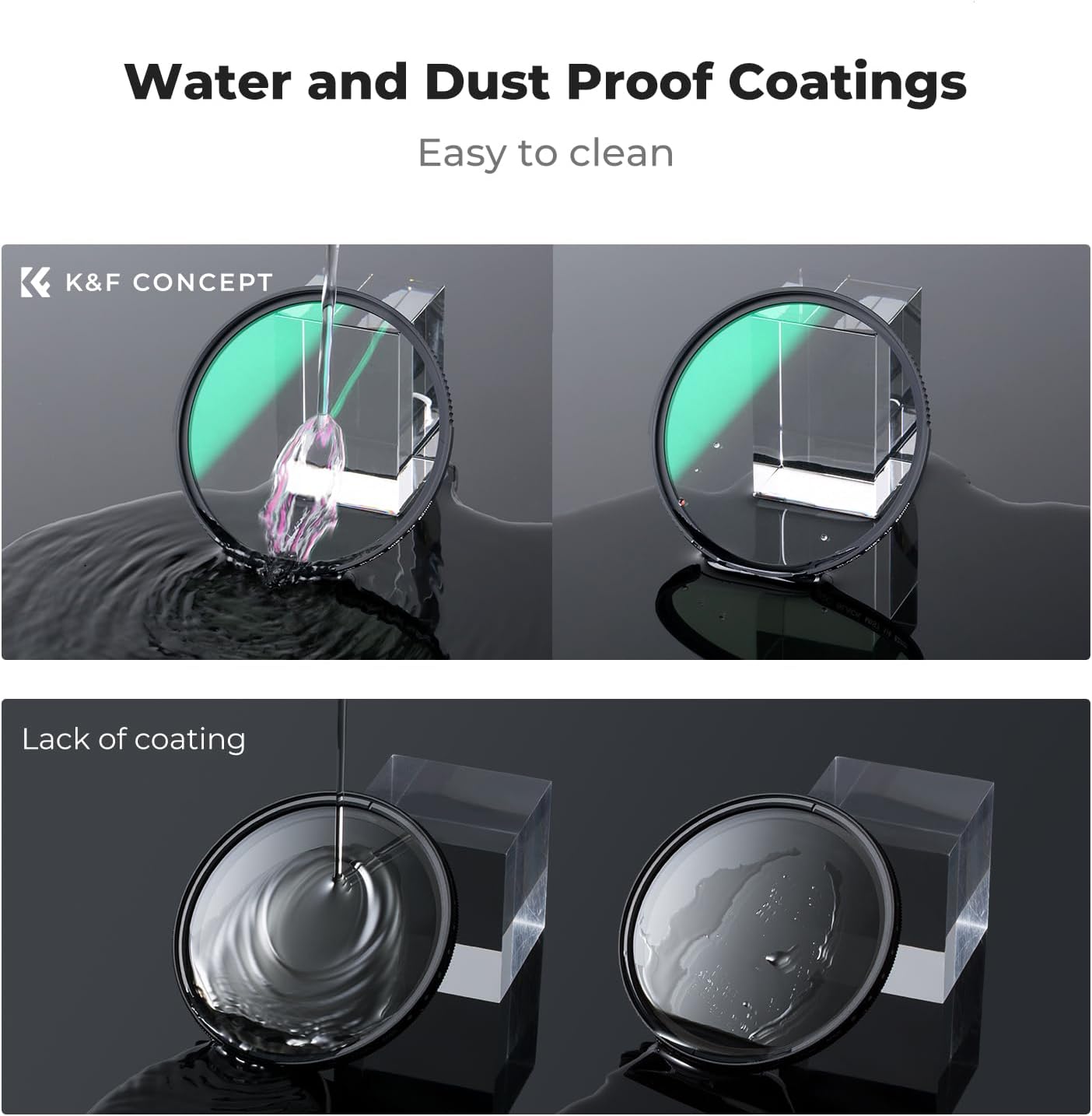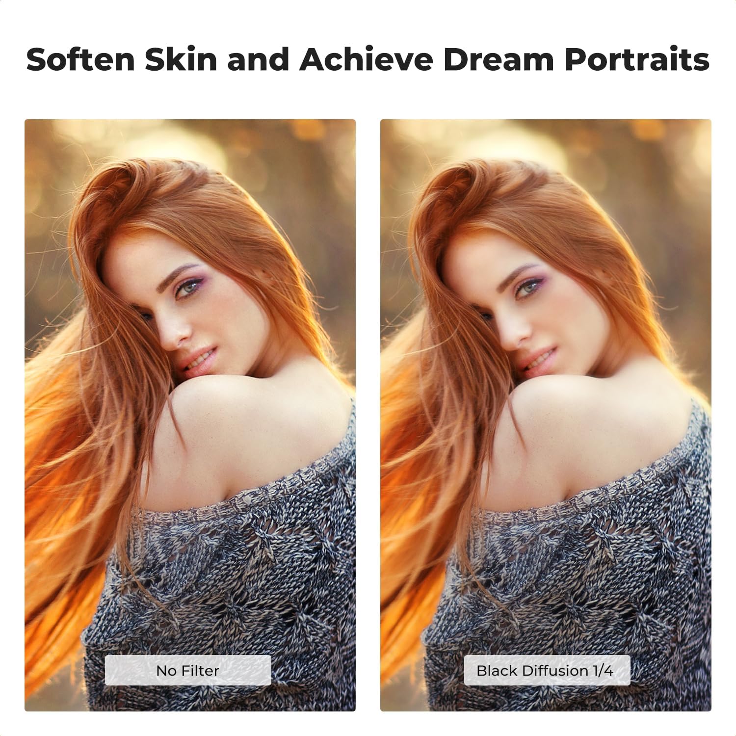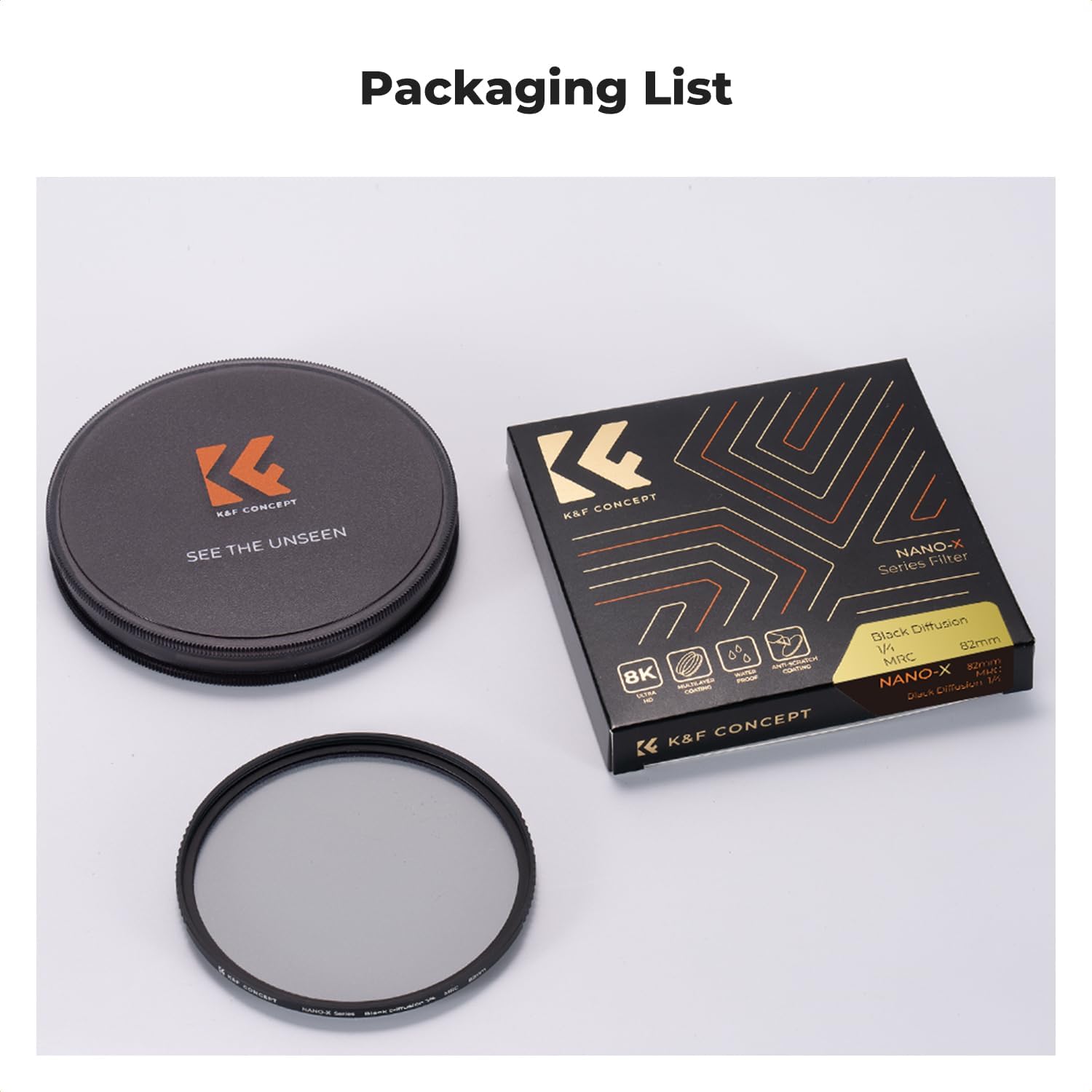 K&F Concept ブラック ソフト 1/4 特殊効果フィルターは、独自の多層反射防止コーティングが施されており、この機能は地面とフィルター自体の反射を効果的に減らし、光線透過率を84%向上させます。 低密度の K&F Concept ブラック シネ拡散 1/4 効果フィルターは、人間の皮膚のシワや毛穴を柔らかくし、ハラレーションを増加させ、効果的で、暖かさの深みを追加し、画像に繊細でかすみな映画効果を見せるが、肌の色調値には移しません。