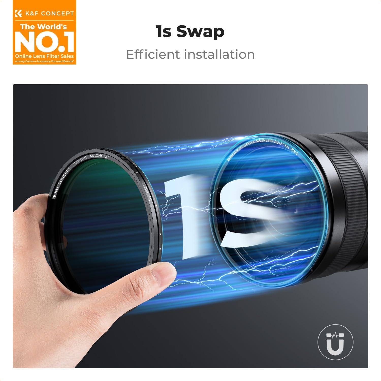 - 【磁気1秒交換】磁気テクノロジーを採用したこの磁気可変ND2-ND32フィルターは、最初にレンズに磁気フィルターアダプターリングを取り付け、その後フィルターを1秒で吸収でき、従来のスレッドフィルター (6s)よりも速く取り付けられます。