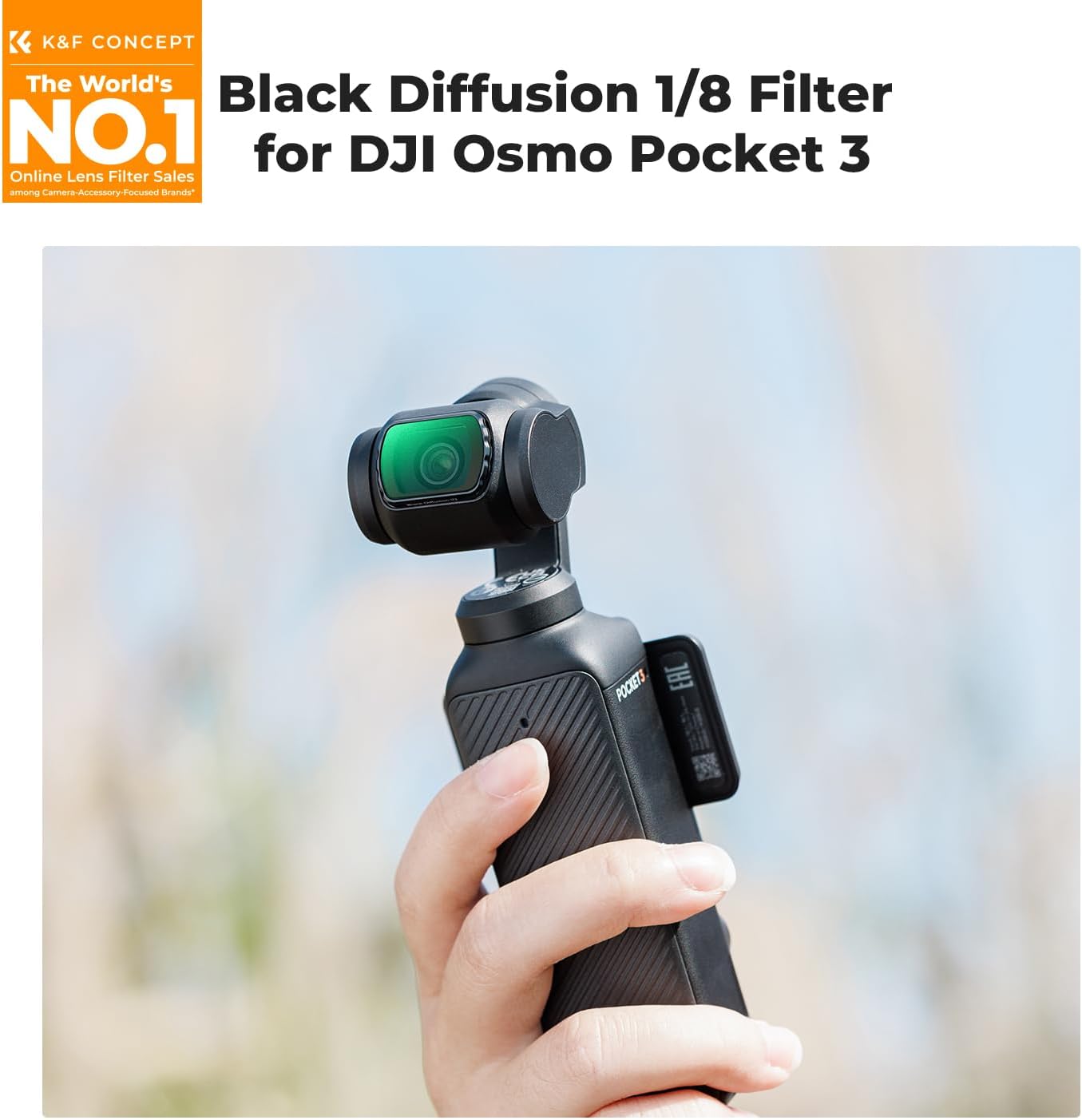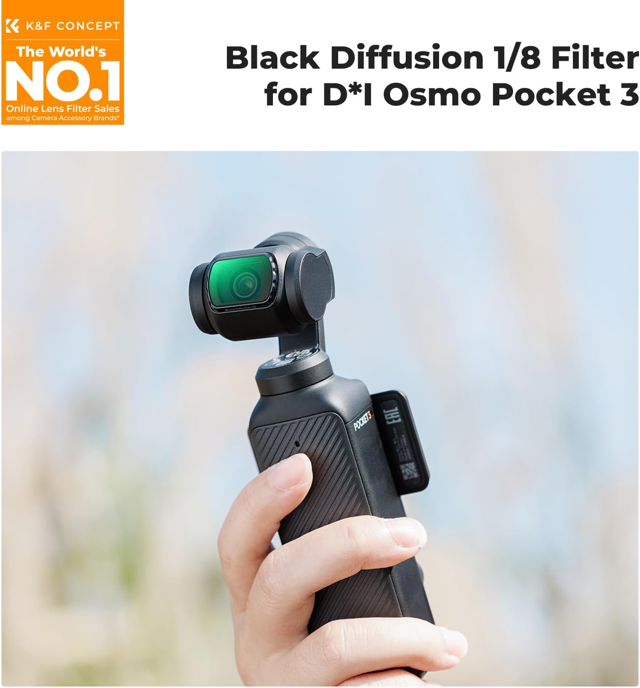 - 【Osmo Pocket 3 Black Diffusion 1/8 Filter】This black diffusion 1/8 filter helps subtlely reduce highlights and lower the glare, reduce contrast, achieving a softer and more dreamy cinematic effect.