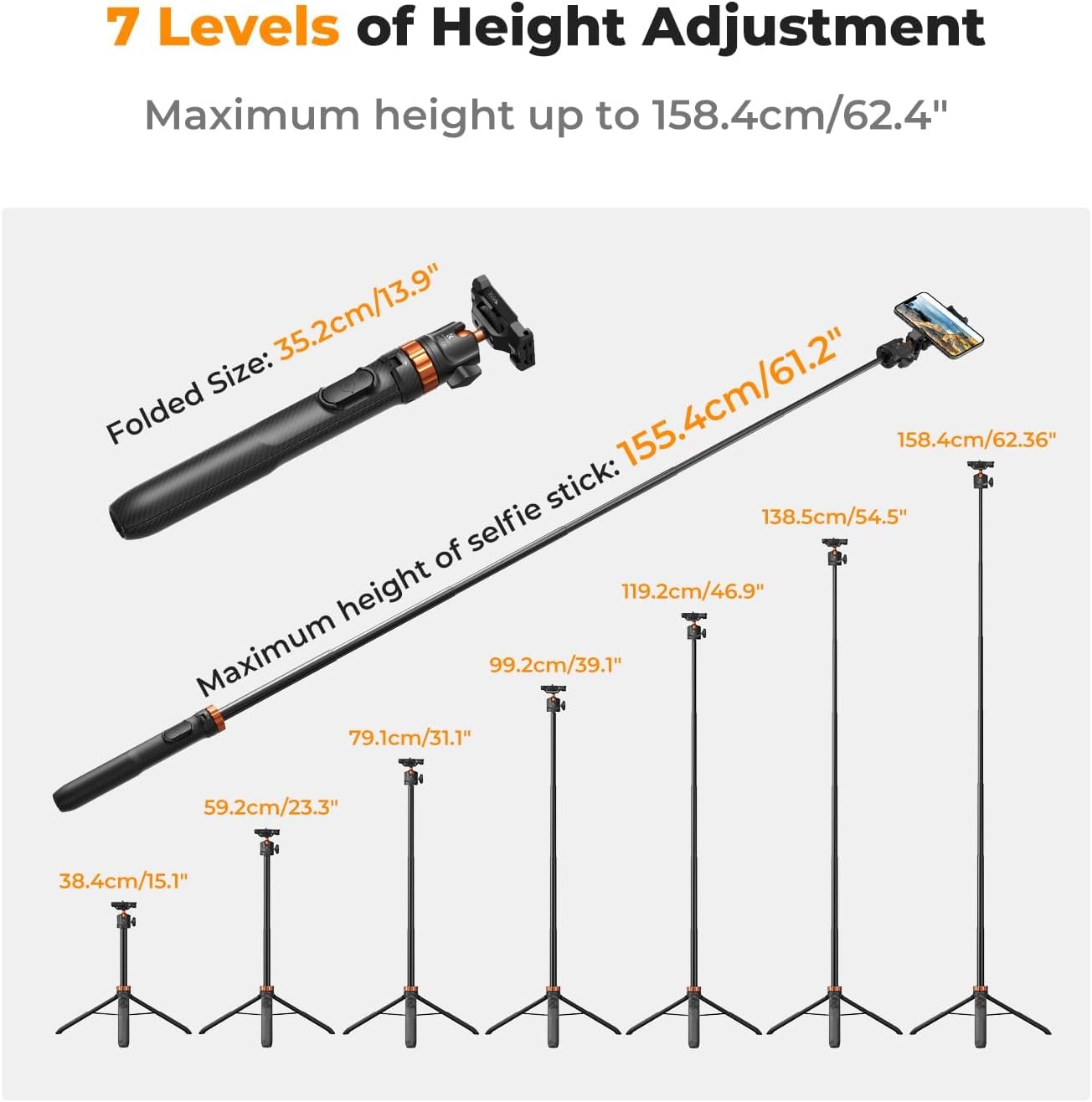 - 調節可能な高さ:7つのセクションの脚調整で最大1.59m/62.5インチに達し、柔軟な撮影高さを提供します。