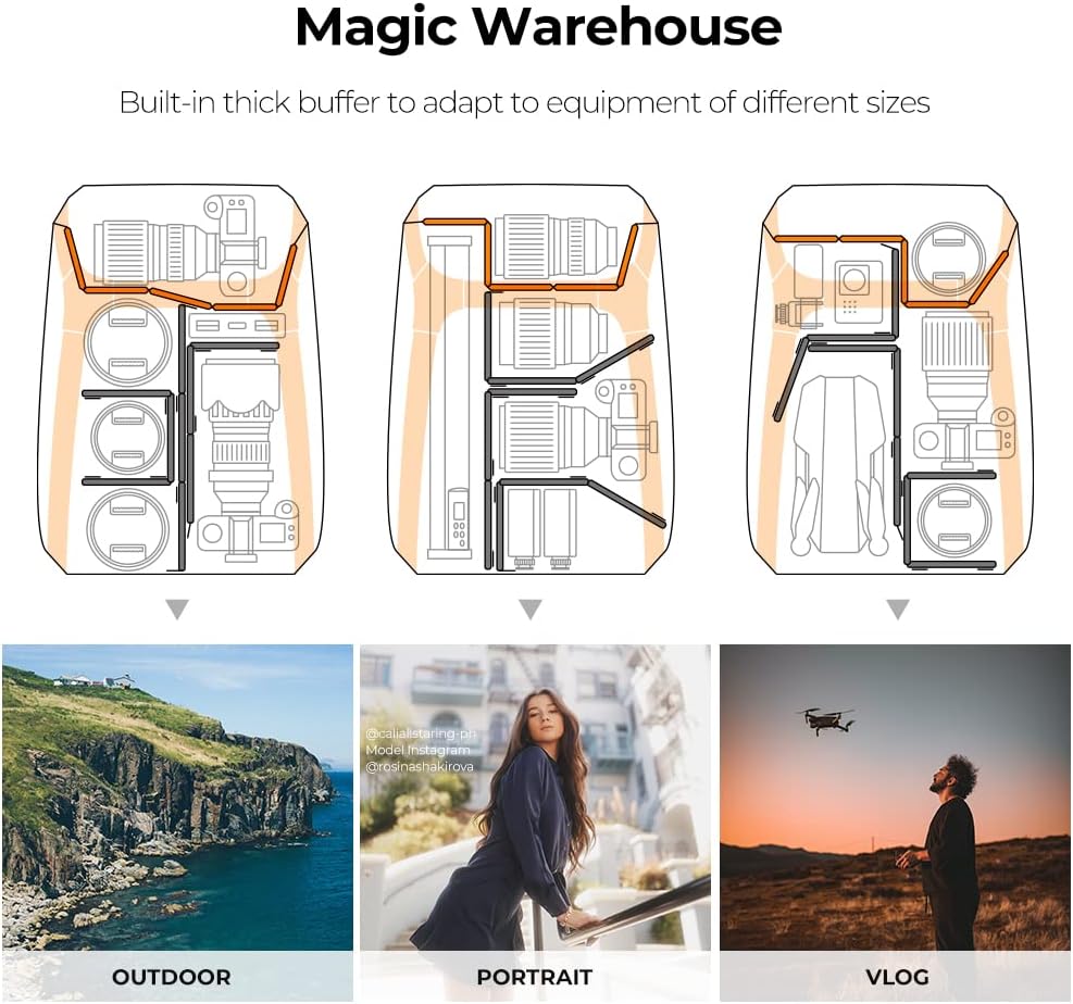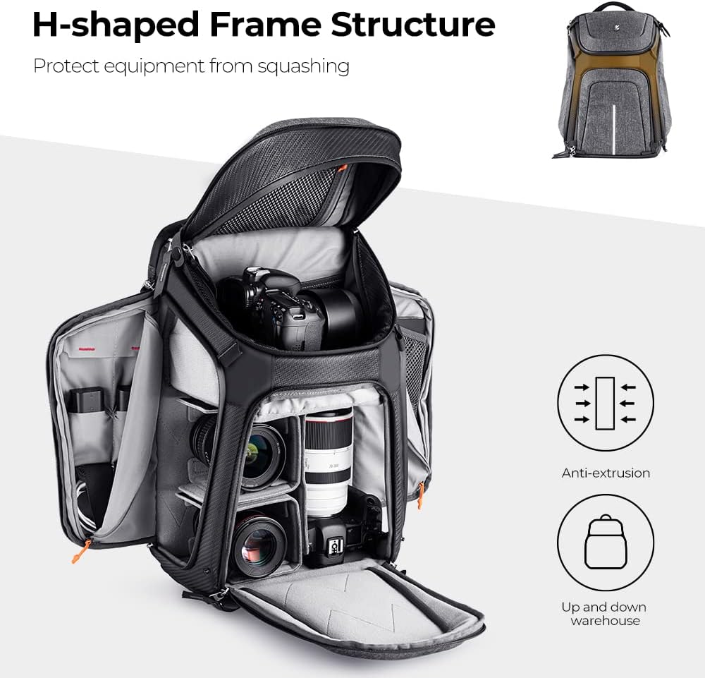 - 【最大容量26.5L】メインコンパートメント容量25Lと拡張容量1.5L。カメラ2台+レンズ4個+ノートパソコン15インチ+10.5インチiPad + 三脚、その他の必需品を収納できます。 トップコンパートメントのサイズはトップコンパートメントを調整することで変更でき、望遠レンズやポータブルスティックライトなどの大型機器を簡単に収容できます。