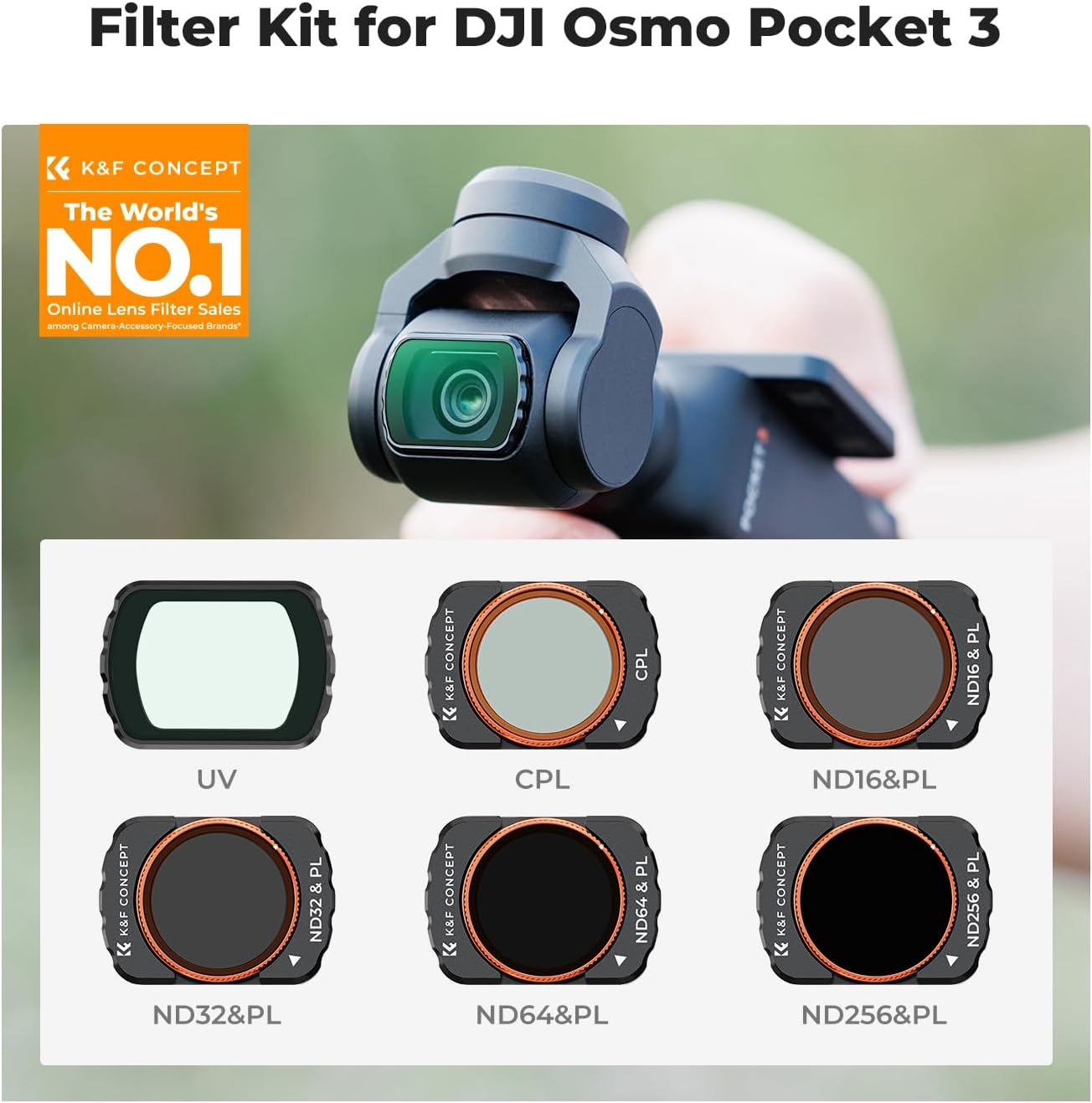 - 【6 Pack Osmo Pocket 3 Filter Kit】This 6 Pack Magnetic Filter Kit from K&F Concept is specially designed for DJI Osmo Pocket 3, which includes UV, CPL, ND16/PL, ND32/PL, ND64/PL, ND256/PL; Made of aluminum alloy frame, HD optical glass filter, features light-weight, ultra-thin, instant attachment, help enhance color, reduce glare and light control in variety of scenarios, it's a great tool set for daily record and vlogging creation.